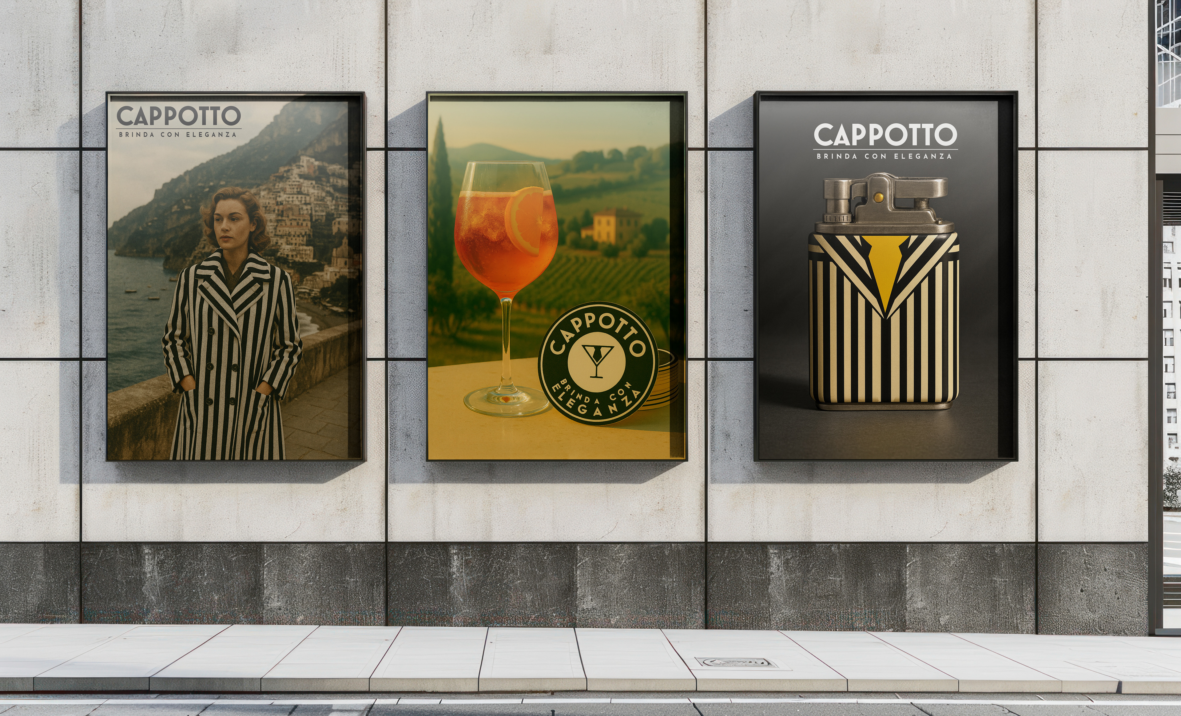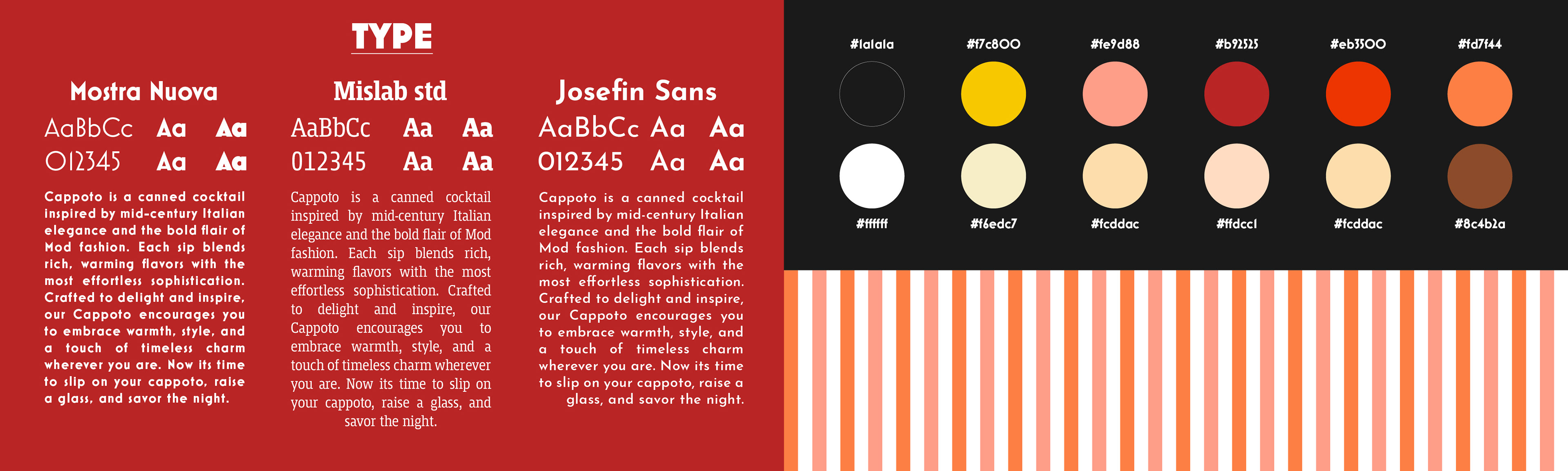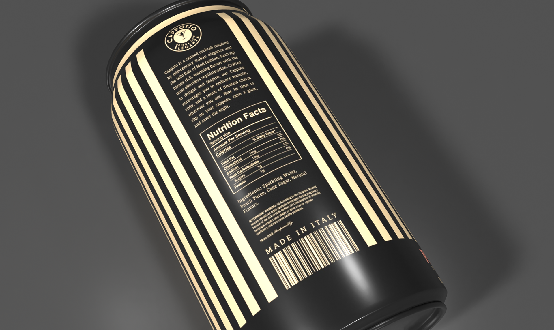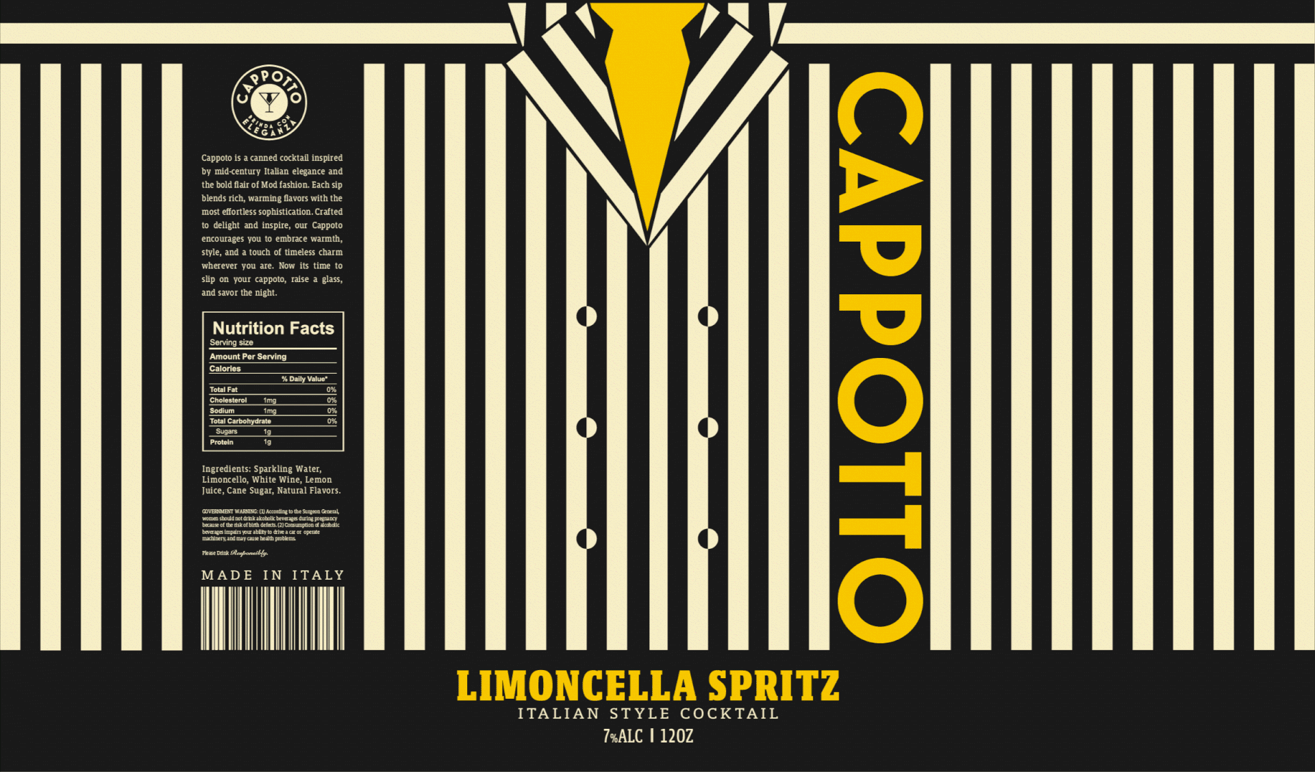Benvenuto in Cappotto! A brand I developed for a new line of refreshing canned cocktails, not only giving you the signature refreshing tastes of Italian mixology, but also the prominent styles of the mid-century wardrobe. I took much of my inspiration from mid-century Italian fashion, from the vintage suit jacket pinstripes down to the suspenders and classic undershirts of the time. and graphic design, resulting in a distinctive collection that blends vintage elegance with modern appeal.