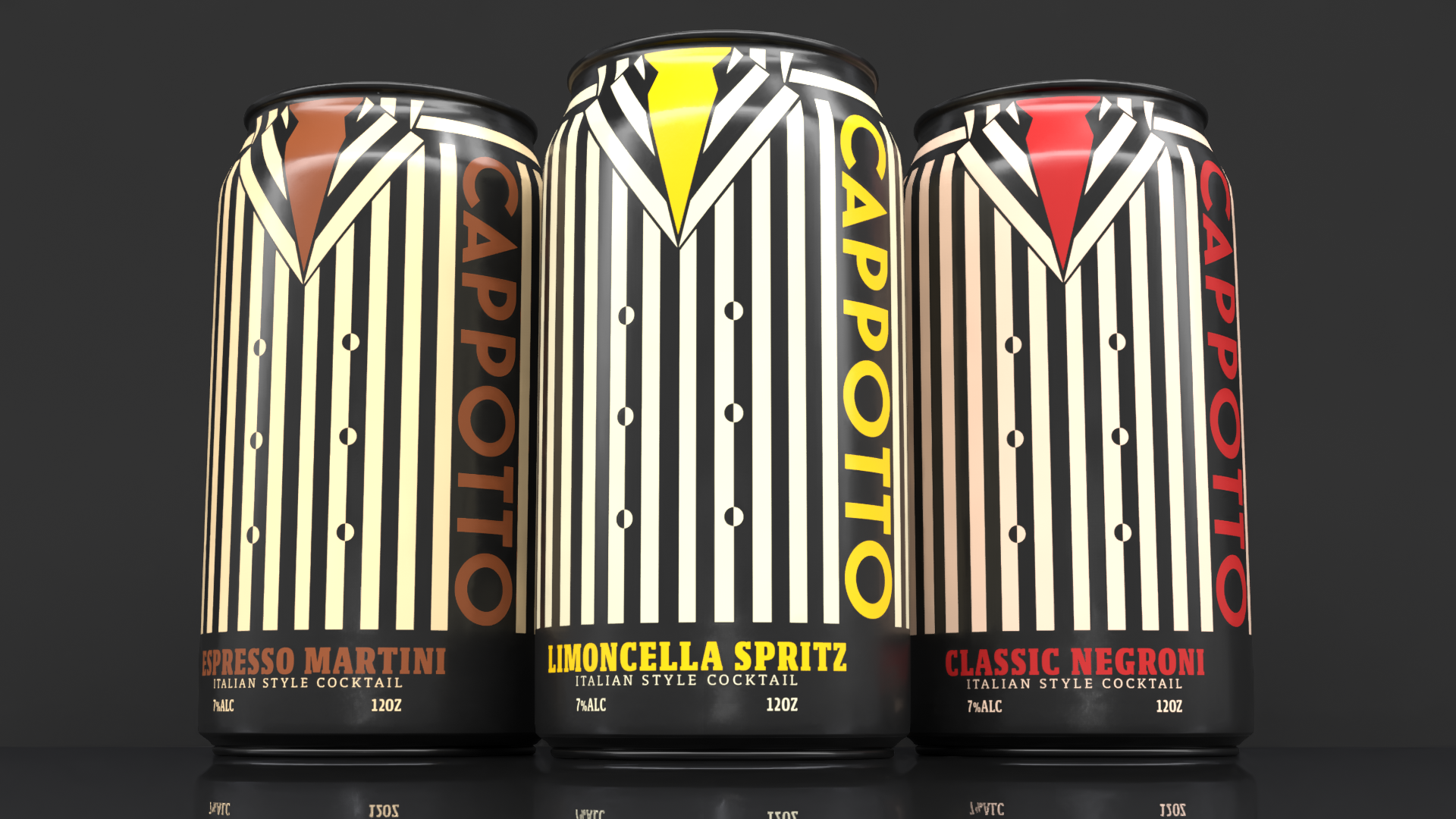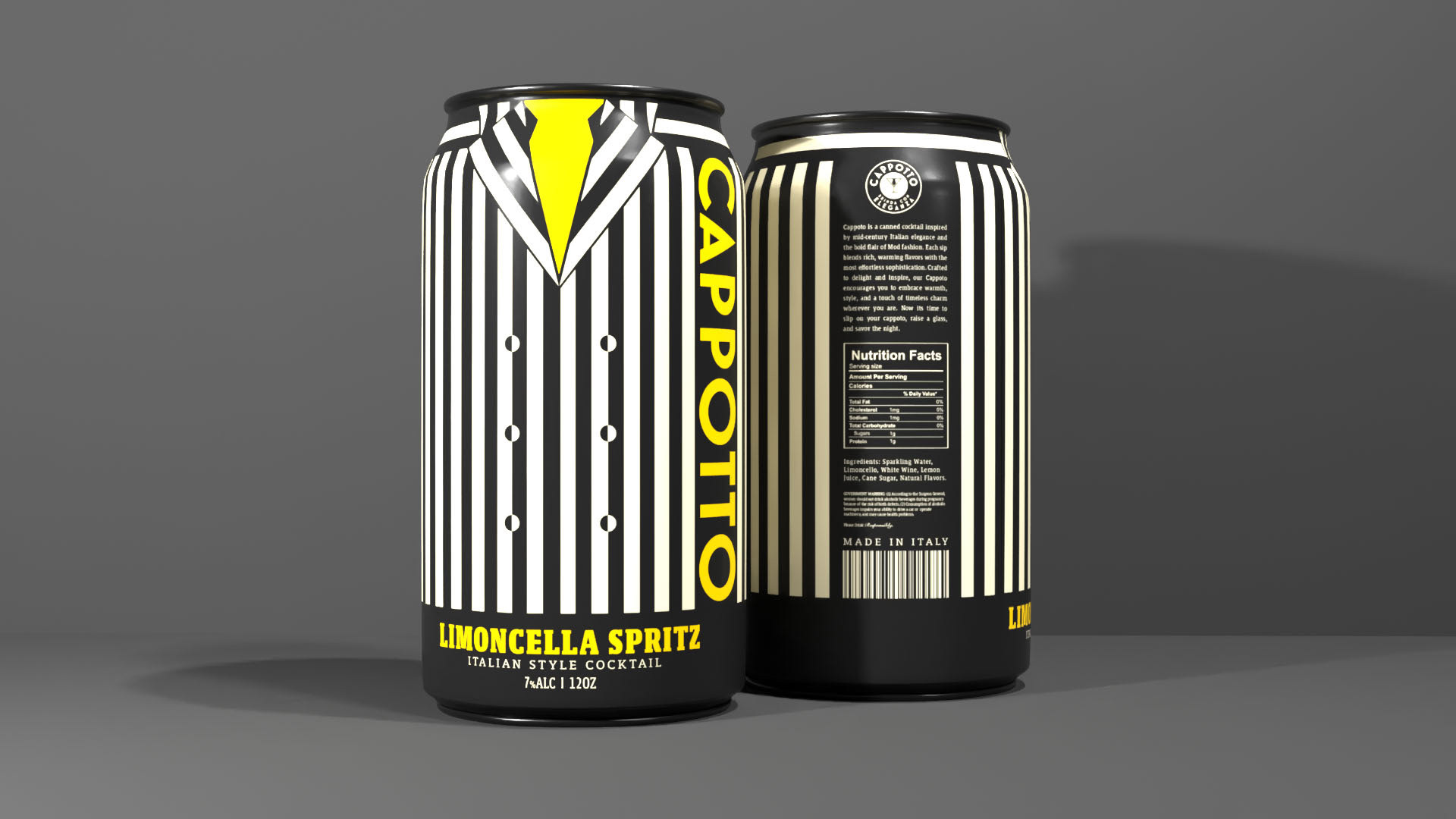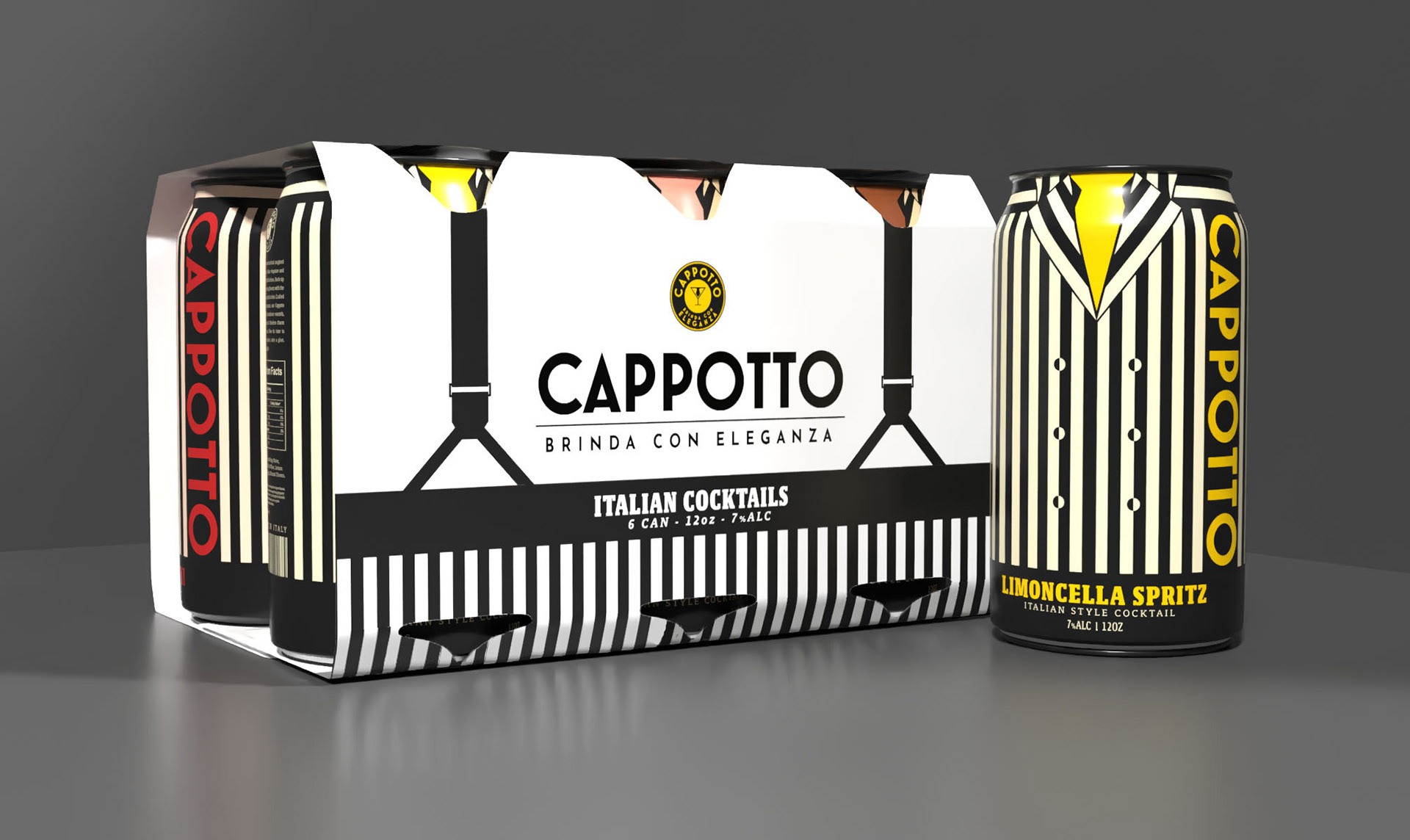 The can labels are all equipped with the classic pinstripe design of many of the overcoats of mid-century Italy to play into the brand name "Cappotto." Each flavor is given a unique, vibrant colorway to demonstrate the iconic visuals of the beautiful Italian cocktails that we all know and love, ranging from the bright, effervescent yellow of the Limoncella Spritz to the much deeper, blood red to deep crimson hue of the Classic Negroni.